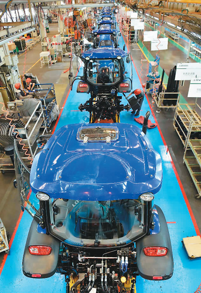 图为位于山东潍坊的雷沃重工阿波斯拖拉机总装车间的生产线。党的十九大召开,明确以供给侧结构性改革为主线,推动经济发展质量变革、效率变革、动力变革,提高全要素生产率。新华社记者 郭绪雷 摄