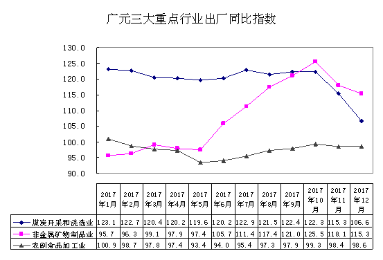 煤炭开采和洗选业、非金属矿物制品业、农副食品加工业等是广元工业的重要行业,2017年三行业价格走势如下图: