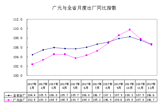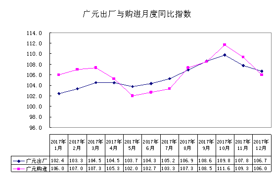 2017年,广元工业生产者出厂价格运行趋势与全省、全国走势基本一致,均呈上涨态势,但涨幅比全省、全国分别低0.9和0.7个百分点。